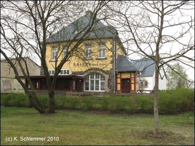 Hier liegen noch Gleisreste zu Erinnerung an die Bahnstrecke. Vorbei am Bahnübergang geht es zum alten Bahnhof.