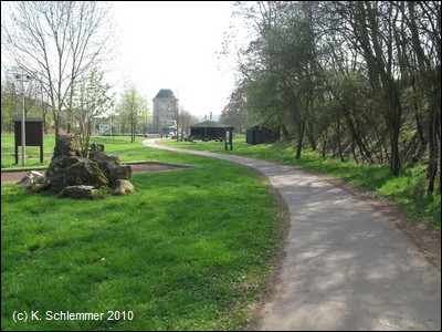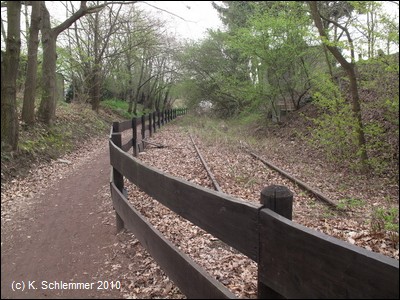 Durch ein parkartiges Gelände führt die Trasse zum alten Bahnhofsgelände. Noch gut 6 km nach Münstermaifeld.