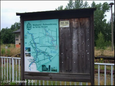 Eine Hinweistafel zum "Muldental-Radwanderweg im Tal der Burgen", immerhin etwas Information in der öden Umgebung. Unsere Spurensuche zur alten Bahnstrecke beginnt auf der südlichen Seite der Bahnstrecke - überall Ruinen und überwucherte Bahngleise.