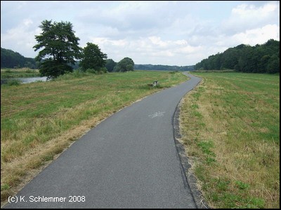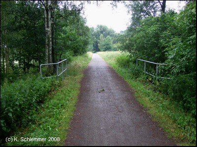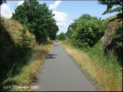 ....dann das abrupte Ende des Radweges auf der Bahntrasse. In einer Kurve geht es auf einem asphaltierten Radweg durch die Felder.