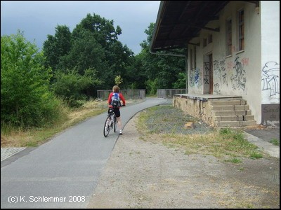 Zum Kloster Nimbschen. Kurz vor der Klosterruine, an einem alten Bahnwärterhaus muss die Trasse für ein paar hundert Meter umfahren werden. Hinter den Mauern des ehemaligen Zisterzienserinnenklosters verbrachte Katharina von Bora, die Ehefrau Martin Luthers, einen Teil ihrer Jugend.