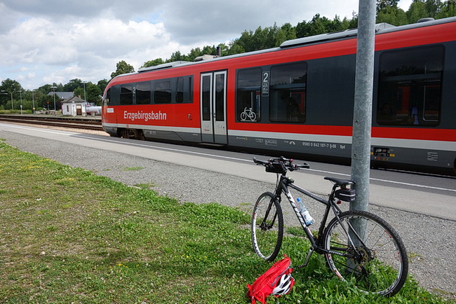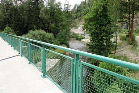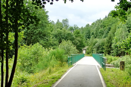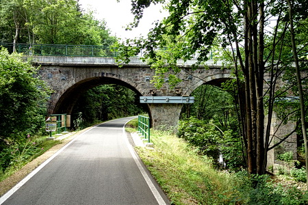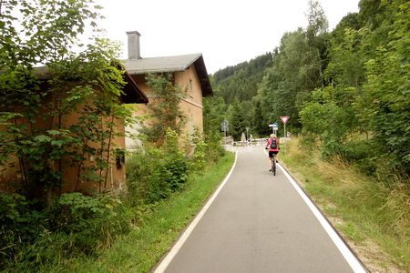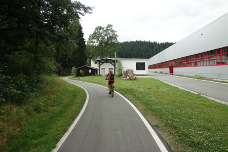 An einem kleinen Parkplatz findet man Informationstafeln zum Radweg. Die Straße muss überquert werden, es geht wieder auf die Bahntrasse. Noch eine Brücke, dann endete im Sommer 2015 der Radweg bei Wolfsgrün an der B 283.