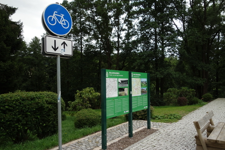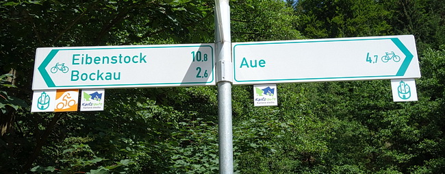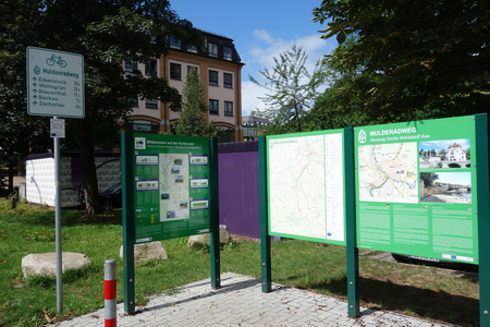 Dort findet man Infotafeln und Entfernungsangaben. Man folgt dem Logo des Mulderadwegs.