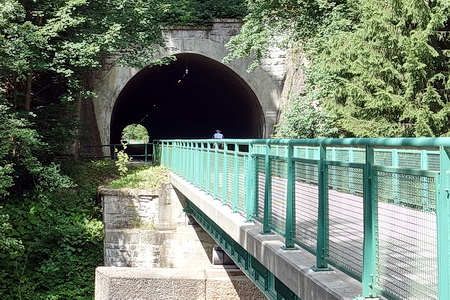 Schon der erste "Tunnel", ein Straßendurchlass (B101) an der Pfarrkirche St. Nicolai in Aue. Auf der breit asphaltierten Trasse geht es leicht bergauf Richtung Auerhammer.