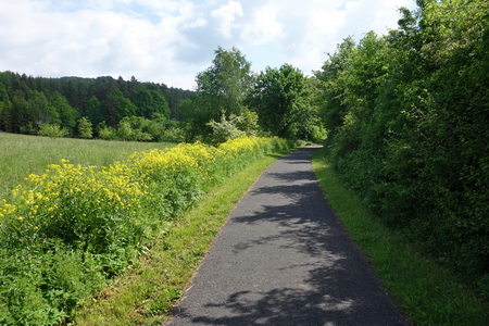 Der Bahntrassenabschnitt endet hier in Oechsen. Der Radweg aber führt weiter am Ortsrand entlang und hinauf Richtung Lenders und zur Emberghütte.