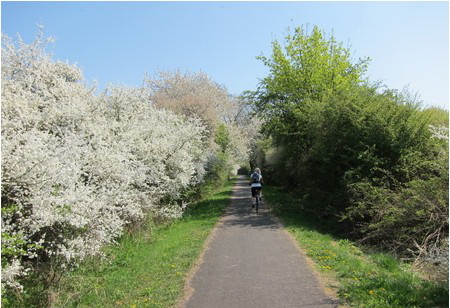 Im Frühjahr durchquert man hier ein wahres Blütenmeer. Dieser Streckenabschnitt benötigte 2016 dringend eine Ausbesserung der Fahrbahnschäden (s. Schild!)