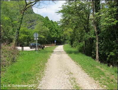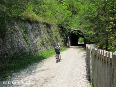 Auch hier gibt es leider Pfostensperren, diesmal mit viel Fantasie gestaltet. Dann folgen die zwei Meda-Tunnel, nur 47 und 88m lang. Vorsicht : Steinschlag in diesem Abschnitt möglich!