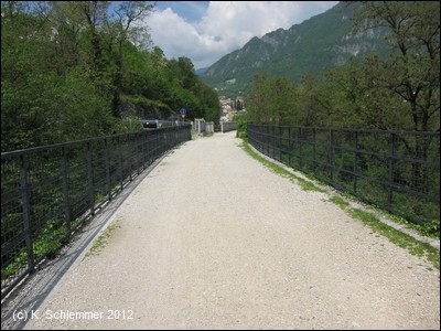 Manche nutzen die Trasse auch als Wanderweg. Vor Seghe di Velo überquert man mehrere kleine Brücken und eine weitere Straßenkreuzung.