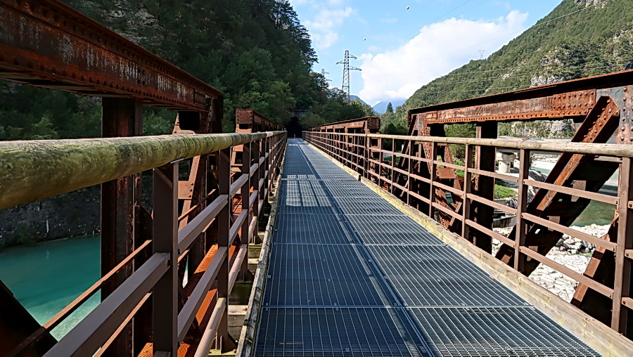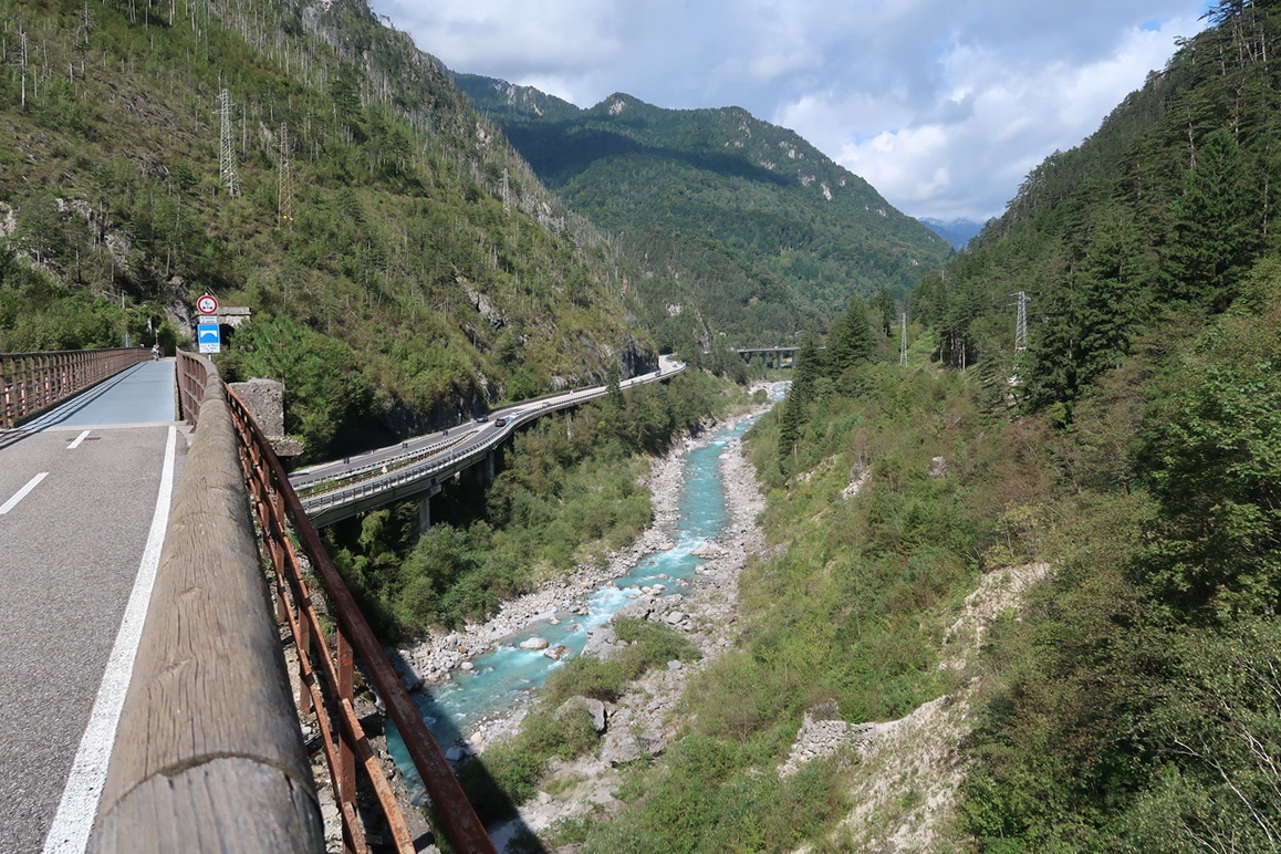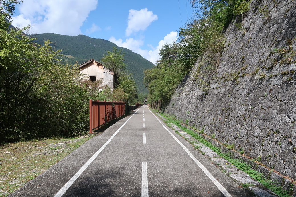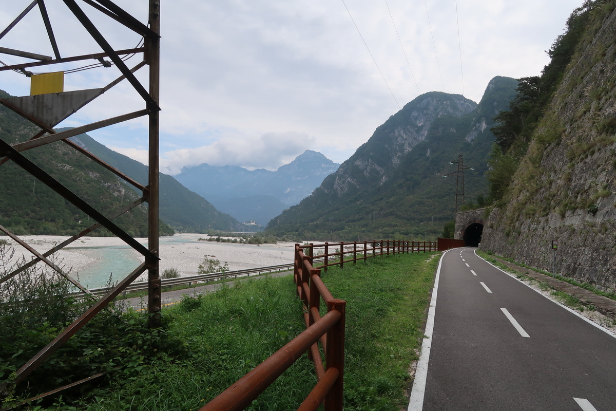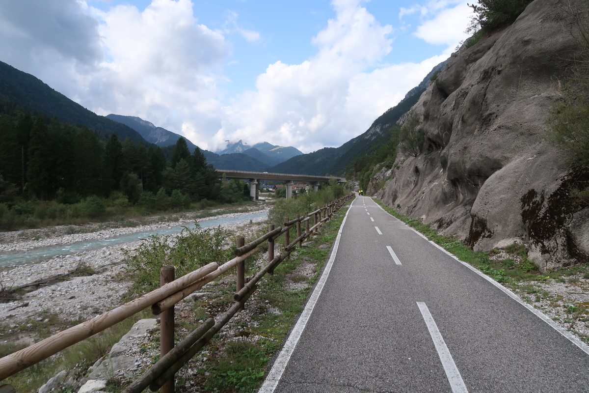 Auf der anderen Flussseite unterquert man zunächst die Alpe-Adria-Autobahn A23, dann die SS13. Danach geht es rechts ab auf den Weg leicht aufwärts am Fluss entlang. Die neue Pontebba-Bahnstrecke (Pontafelbahn) überkreuzt den Radweg und verschwindet in einem fast 5,6 km langen Tunnel, aber auch die Radler haben einige (allerdings viel kürzere) Tunnel vor sich.