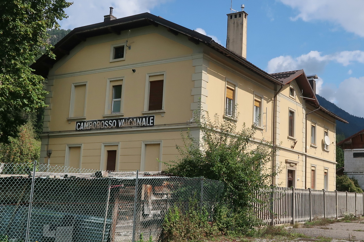 Die nächste Station ist Camporosso in Valcanale. Die Schrift am Bahnhof ist noch lesbar.
