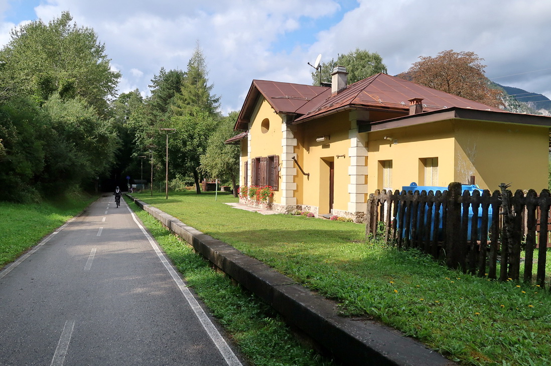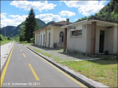 Der Bahnhof Chiusaforte wurde zum Bistro umgebaut, und viele Radler nutzen das schöne Eisenbahnambiente zu einer Rast. Ein Blick zurück zum Bahnhof, vorbei an dem alten Wasserkran für die Dampfloks.