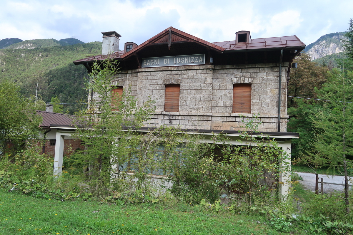 Reichlich Sperren, aber wenigstens rund und mit weitem Abstand. Es geht vorbei am alten Bahnhof Valbruna Lussari, das Gebäude hat schon bessere Zeiten gesehen.