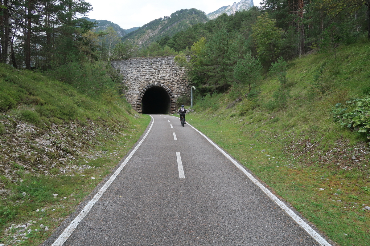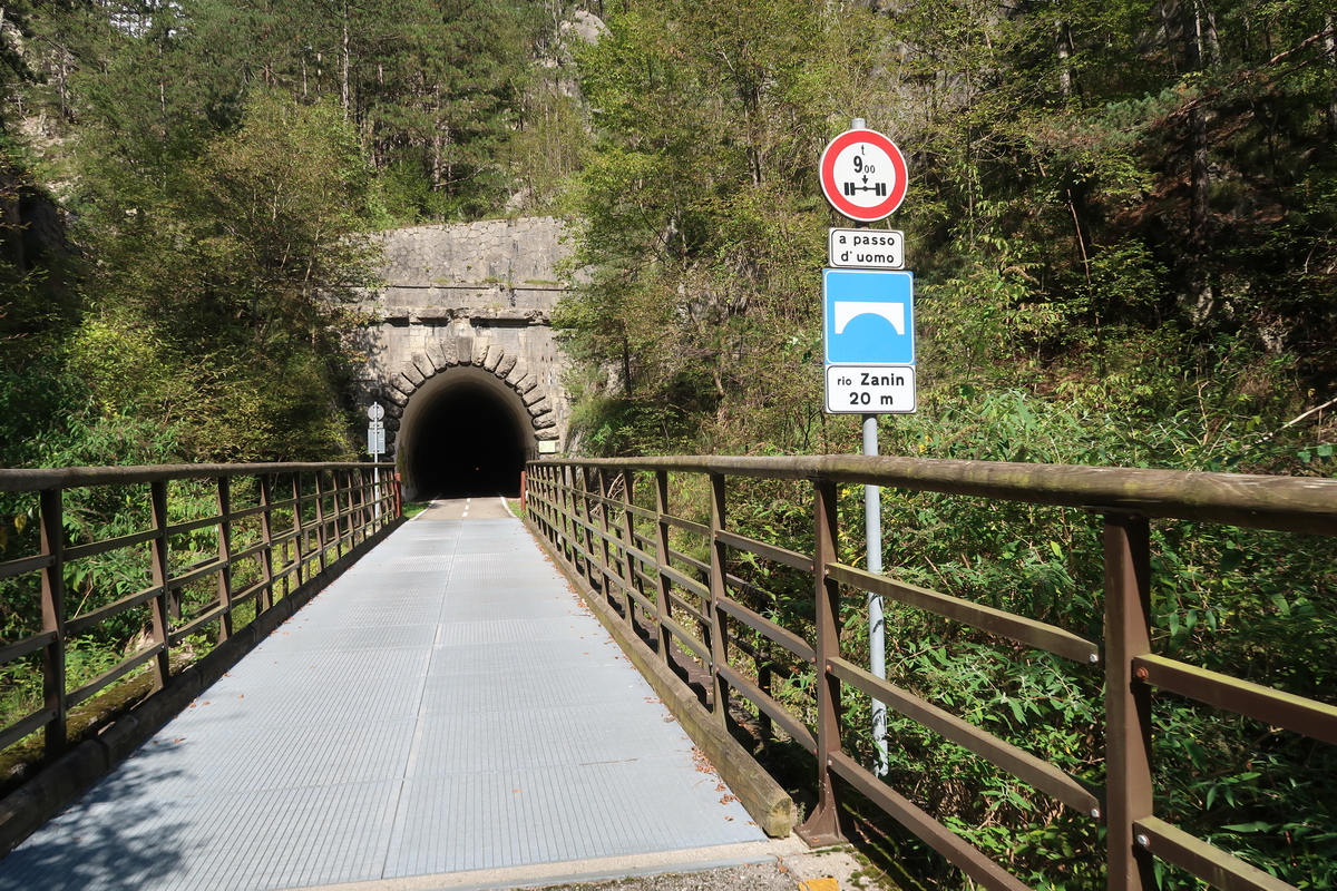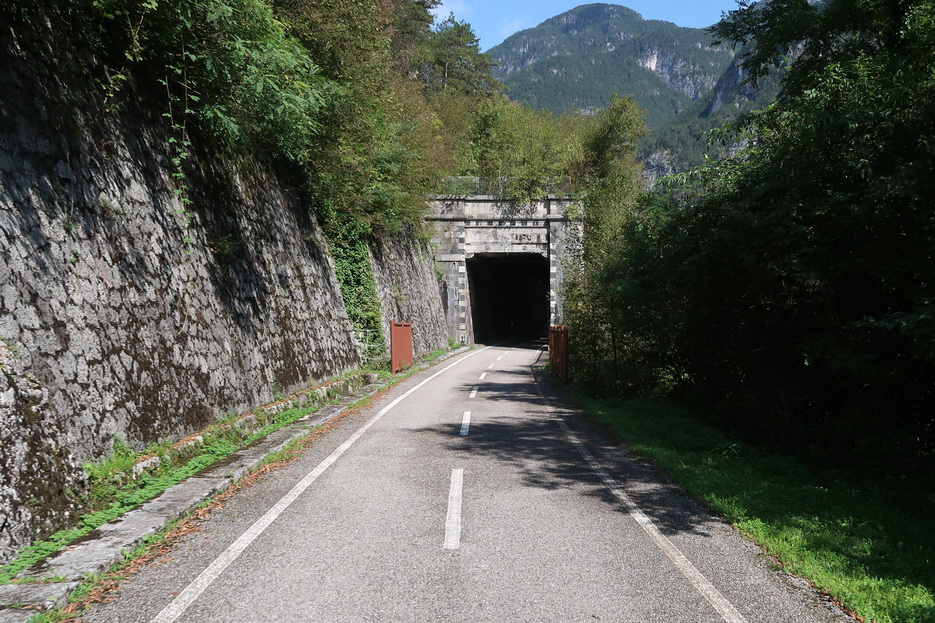 Der Höhepunkt des neuen Abschnitts: Tunnel Cinque Rivi, 942,88 m lang (steht auf der verblichenen Tafel am Tunneleingang)