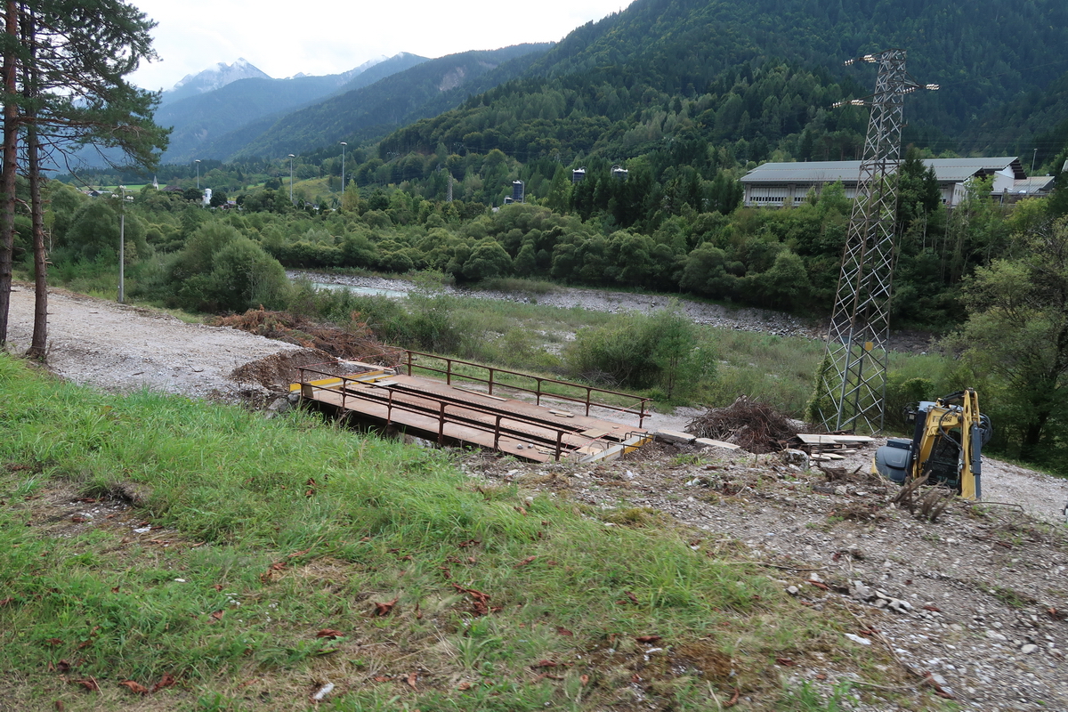 Auch die aktive Bahnstrecke überkreuzt den Radweg. Auch eine neue kurze Brücke über die Fella, hier noch ein kleines Gewässer, wurde notwendig.