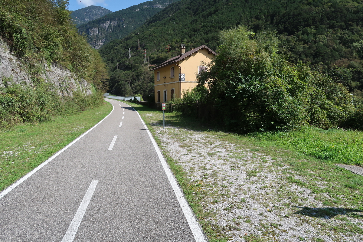 Am alten Bahnhof von Laglesie San Leopoldo beginnt wieder der Radweg auf der Trasse.