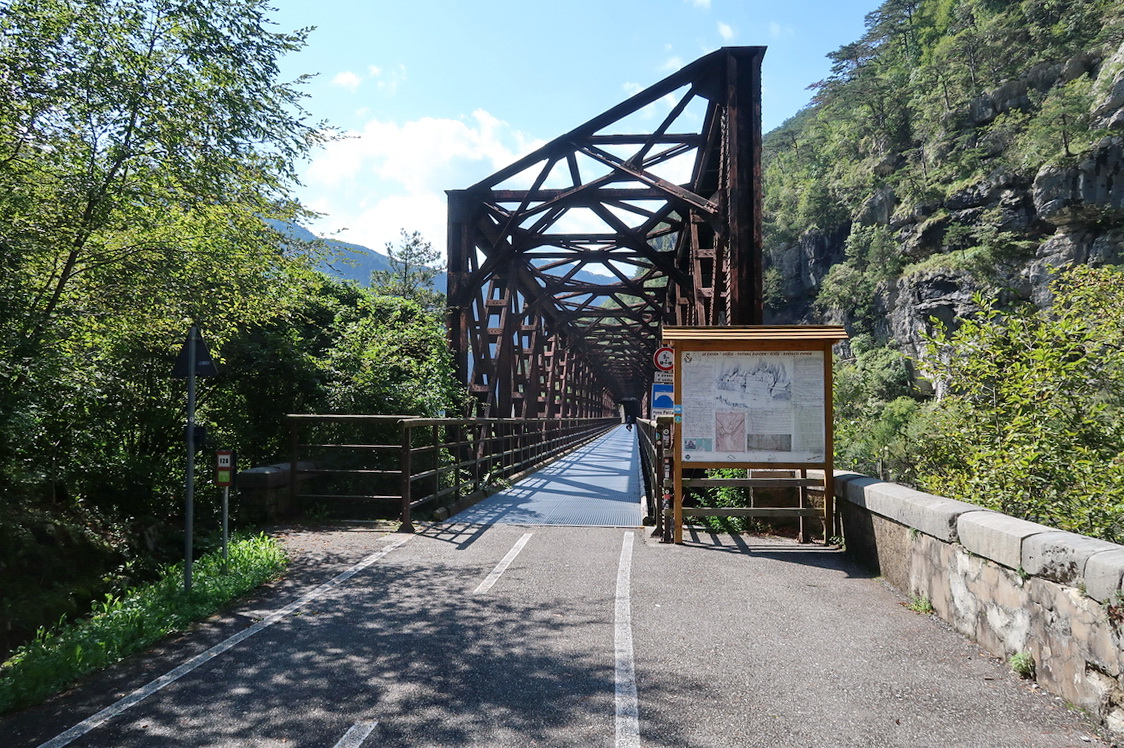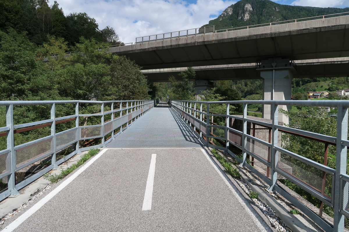 Das ab Pontebba recht breite Tal der Fella biegt nun Richtung Osten ab. Der Radweg am Ortsausgang verläuft direkt neben der Staatsstraße aufwärts. Das Tal ist hier stark von Brücken überbaut. Der Abschnitt ist auch hier mit den Wegweisern des Alpe-Adria-Radwegs beschildert.