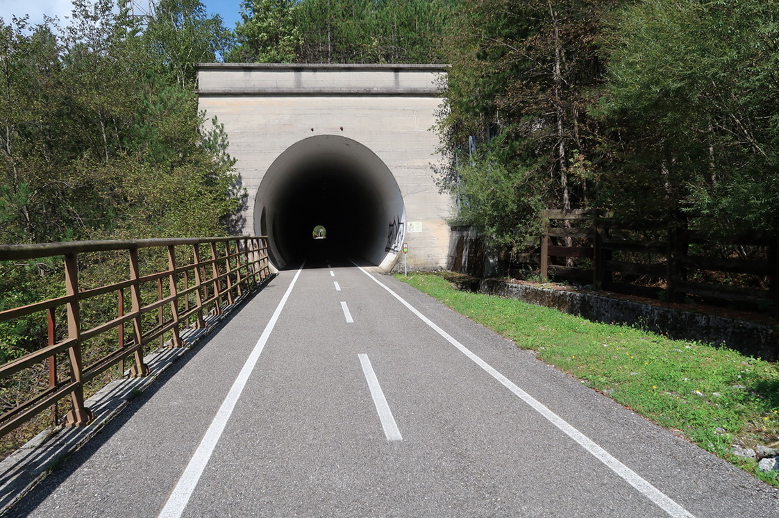 Nach ein paar hundert Metern ist das Ende des Radwegs auf der Bahntrasse erreicht. Der fast zugewachsene Große Goggauer Tunnel Richtung Österreich (517 m) ist nicht befahrbar, der Alpe-Adria-Radweg führt über den Pass von Coccau.