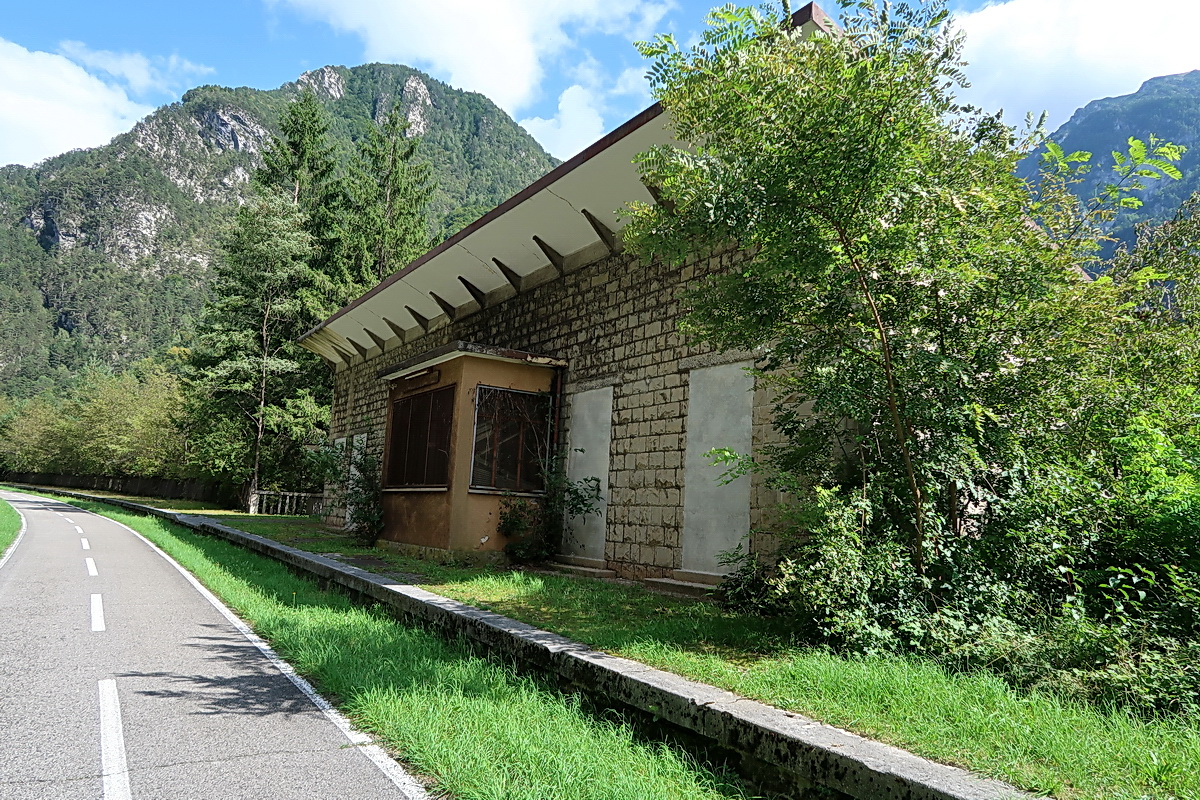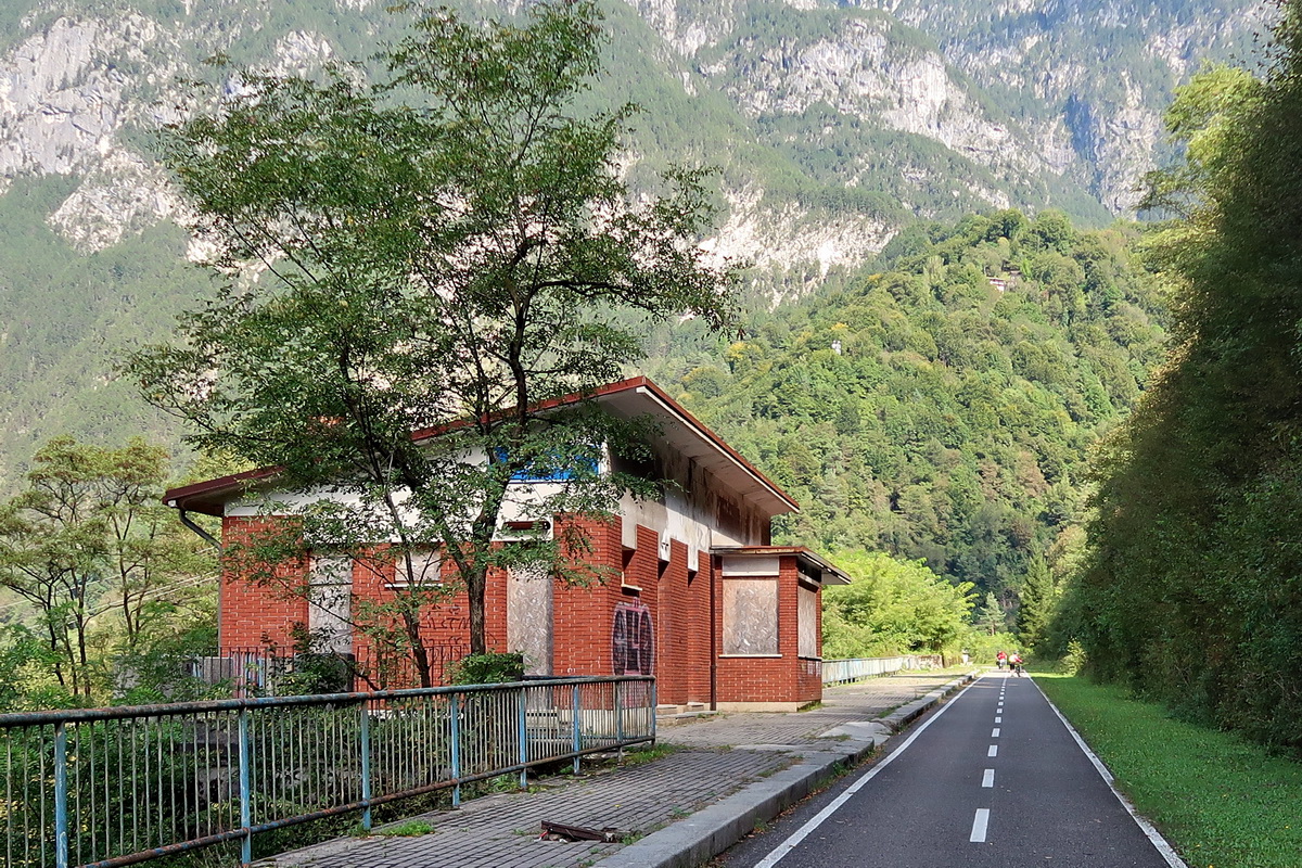 Über die Brücke, dann ein kurzes Stück auf dem Seitenstreifen bis zum Abzweig nach Resiutta. Hier tangiert man bereits den nicht ausgebauten Abschnitt der alten Pontebbana, die sich in Tunneln und Galerien rechts neben der Straße im Gehölz versteckt. Die Bahntrasse kreuzt auf die linke Seite, am Ortseingang erreicht man den verlassenen Bahnhof von Resiutta.