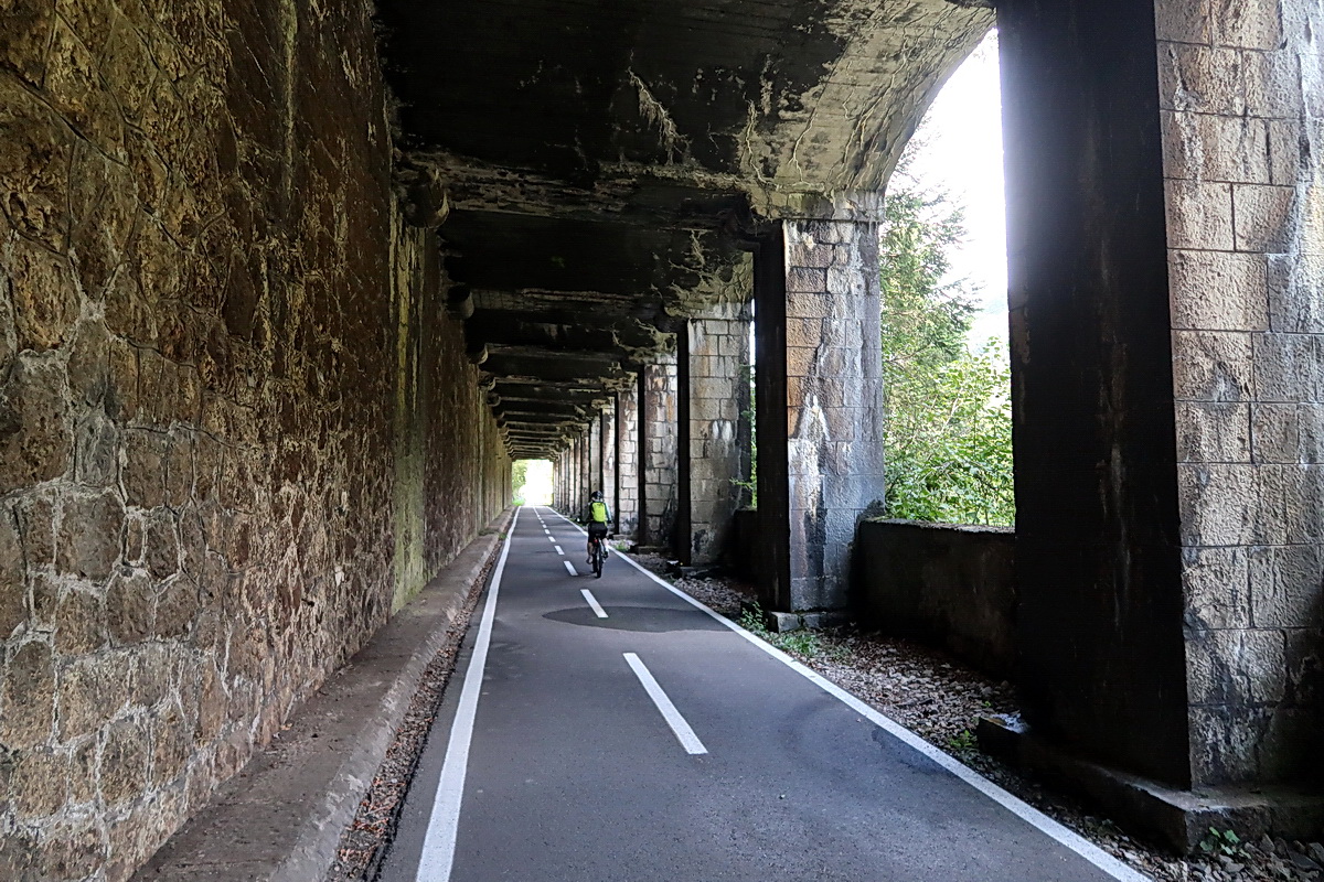 Im Jahr 2011 waren die beiden folgenden Tunnel noch nicht ausgebaut, Die Umgehung führte über eine Treppe hinab auf eine Nebenstraße. Das Viadukt am Streckenposten war ebenfalls nicht befahrbar. Diese Unterbrechungen waren 2025 beseitigt.