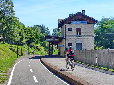 Im Nordosten Italiens, im Dreiländereck zwischen Österreich, Italien und Slowenien, findet man einen der schönsten Bahntrassenradwege Italiens: den Radweg auf der alten "Pontebbana" - Eisenbahnstrecke. Mit Mitteln der EU wurde auf der stillgelegten Bahnstrecke von Tarvisio nach Carnia ein 53 Kilometer langer Radweg angelegt, der am Fella-Fluss entlang (Kanaltal / Valcanale) durch die Berge von Friaul-Julisch Venetien führt. Besonders der Abschnitt zwischen Carnia und Pietragliata ist gespickt mit Tunneln und Brücken. Die Ausblicke über das Flusstal und die umgebenden Berge sind atemberaubend. Die Strecke ist sehr gut ausgebaut und asphaltiert, gut beschildert, und man kann sich kaum verfahren. Die langen Tunnel sind beleuchtet, mit Ausfällen oder Vandalismus muss man rechnen, eine Beleuchtung am Fahrrad ist deshalb erforderlich (Hinweisschilder an den Tunnelportalen).