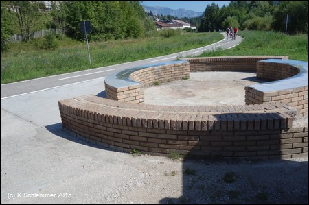 Unter der alten Signalbrücke durch erreicht man einen Rastplatz, an dem die Route nach Slowenien abzweigt (Bahntrassenradweg Tarvisio - Kranjska Gora - Mojstrana :"Kronprinz Rudolf-Bahn"). Auch wer zum Bahnhof Tarvisio Bosco Verde (aktuelle Eisenbahnstrecke) möchte, muss hier abbiegen. An dem kleinen Parkplatz am Bahnhof gibt es eine Unterführung zu den Gleisen und zu den Parkdecks auf der anderen Seite der Gleise.