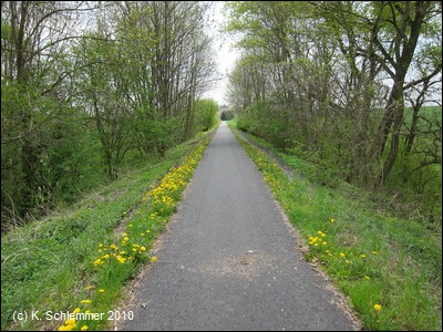 Kerzengerade durchzieht der Radweg die Frühlingslandschaft. Manche Skulpturen, wie diese "Mitra", liegen fast versteckt am Rande der Strecke.