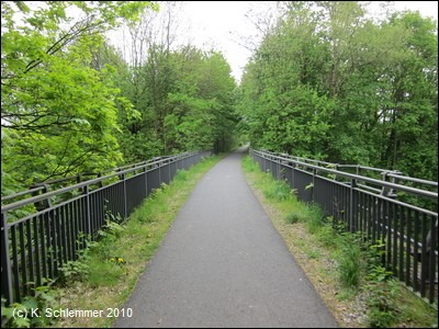 Eine alte Brücke überquert die Trasse. "Begegnung" heißt das folgende Kunstwerk.