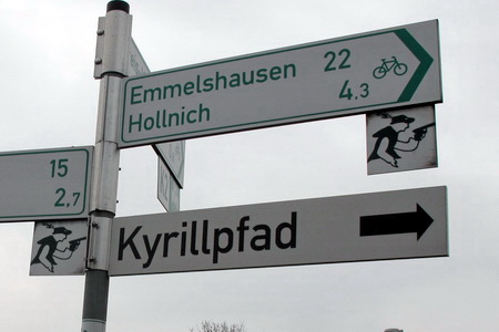 Vorbei am Bahnhof Ebschied. Beschilderung mit Schinderhanneslogo in Kastellaun.
