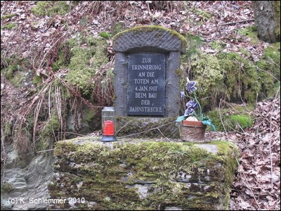 Eine Gedenktafel erinnert an die Toten beim Bau der Bahnstrecke. Straßenquerung in Leiningen.