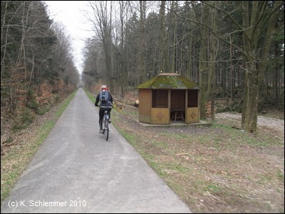 Die Rasthäuschen am Rande der Strecke bieten auch Schutz vor Regen. Einige Hektometersteine der Bahnstrecke sind erhalten.
