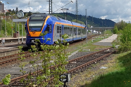 Ankunft am Bahnhof von Bad Hersfeld, Anreisemöglichkeit für Radler mit der Cantusbahn. Direkt gegenüber liegt der ehemalige Bahnhof der Hersfelder Kreisbahn. Im Frühjahr 2009 wurde der Solztalradweg als Teil des "BahnRadweg Hessen" mit eigenem Logo ausgeschildert, hier befindet sich der Kilometer Null. Vom Parkplatz auf der stadtabgewandten Seite des Bahnhofs (Heinrich-Börner-Str.) fährt man in nördlicher Richtung entlang der aktuellen Bahnstrecke.