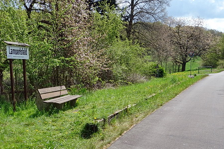 Der nächste Halt ist Lampertsfeld, mit einer Ruhebank! Dann, plötzlich, ist die Fahrt auf der Trasse zu Ende.