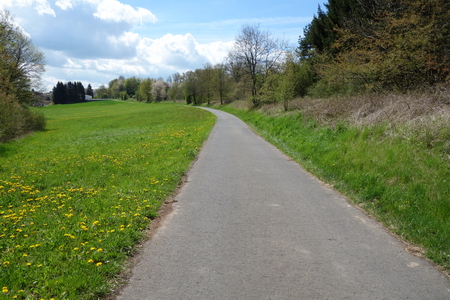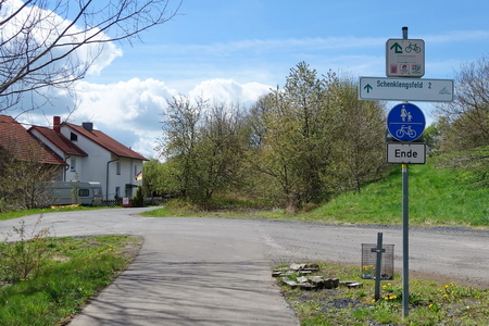 Neben dem Schotterbett der alten Trasse folgt man dem asphaltierten Weg bis zur Kuppe am Ortsrand von Schenklengsfeld.