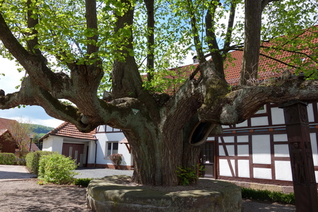 Der Radfahr-Pavillon steht an der Straße, nicht gerade idyllisch, aber ein guter Schutz bei Regenwetter. Die uralte LInde im Ortszentrum sollte man jedenfalls nicht übersehen. Über das tatsächliche Alter wird noch diskutiert, mindestens 600 Jahre, wahrscheinlich aber um die 1200 Jahre soll der Baum schon leben.