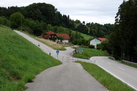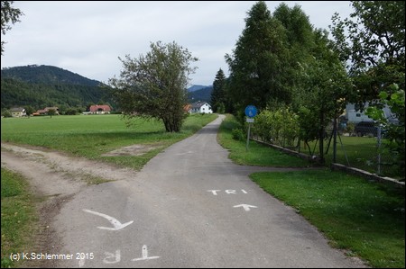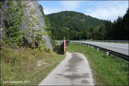 Nach Überquerung der Bundesstraße (Blick zurück) folgt man weiter den Wegweisern des R8 (Steyrtalweg), auch hier ist die ursprüngliche Bahntrasse offensichtlich zerstört.