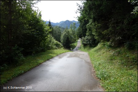Vorsicht an der Kreuzung mit der Bundesstraße! Dann geht es zügig bergab.