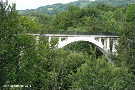 Wir befinden uns hoch über der Steyr, am Steyrdurchbruch. Gegenüber erkennt man die große Brücke der B140, 205 m lang und 35 m hoch. Wir fahren über die Bogenbrücke des Radwegs...