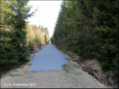 Hier war im April 2011 noch die Leitplanke im Weg. Dahinter beginnt ein wunderschöner Bahntrassenradweg abwärts durch den Wald.