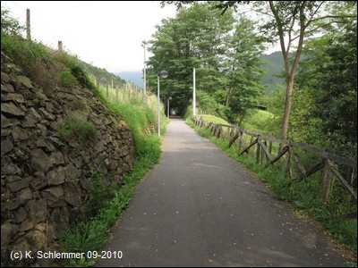 Die Straße wird überquert, es geht nun etwas stärker aufwärts. Die Bahntrasse ist unverkennbar.