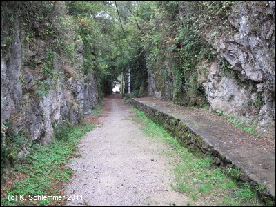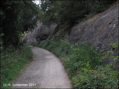 Nun sind wir wieder in der Natur, eine Felswand und Befestigungsmauern begrenzen die alte Minenbahnstrecke.