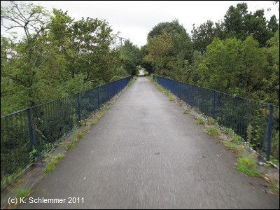 Vorbei an den letzten Häusern der Stadt erreicht man den Wald. Dies ist ein schöner Abschnitt des Radwegs auf der alten Bahnstrecke.