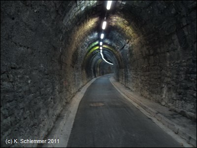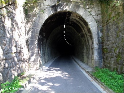 Auf asphaltierter, ebener Strecke geht es kaum merklich bergauf. Schon folgt der erste von vier Tunneln: Túnel del Venero, sehr gut beleuchtet.