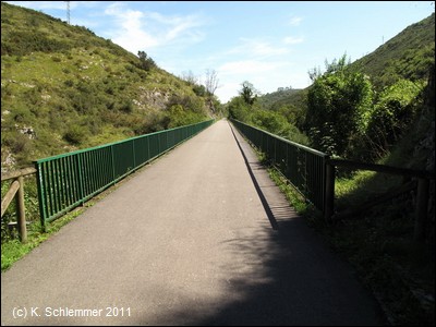 Etwas verwirrend für den ortsfremden Radler sind die Beschilderunen der asturianischen Vias Verdes. Am alten Bahnhof Fuso de la Reina endet die Via Verde Tuñon - Fuso de la Reina, manchmal auch als Teil des Radwegs Senda del Oso ausgewiesen. Es beginnt die Vía Verde de Fuso auf der stillgelegten Bahnstrecke nach Oviedo. Asphaltiert - wenn auch an einigen Stellen beschädigt - fährt man mühelos die rund 100 Höhenmeter vom Río Nalón in die Hauptstadt Asturiens. Vier Tunnel und ein großes Viadukt sowie fünf Brücken hat die 8 km kurze Strecke aufzuweisen. Die Fahrt endet im Parque de Invierno in Oviedo vor dem vermauerten Tunnel von San Lázaro Sur.