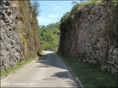 Direkt nach dem Tunnel folgt eine Brücke, dann ein steiler Einschnitt mit senkrechten Felswänden