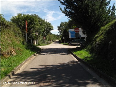 An der folgenden Kreuzung haben die Radler ein Stoppschild! Die Reste eines Sperrpfostens ragen aus dem Boden.