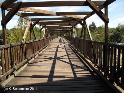Eine alte Brücke überquert die Trasse, dann eine neue Straßenbrücke.