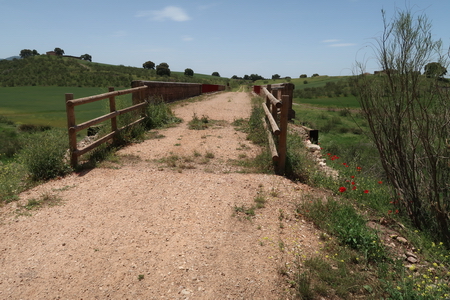 Die Beschilderung ist marode, der Weg ist Teil der Ruta de Don Quijote, die nach der Brücke rechts abbiegt und weitab der Bahntrasse durch die Felder führt.