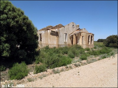 "Gefährliche Kreuzung* - kein Mensch in Sichtweite, Der Bahnhof Bienservida, eine Ruine wie all die übrigen Gebäude der Bahnstrecke.