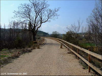 Man folgt der N-322 einen knappen Kilometer weiter westlich, dann biegt links ein kurzer steiler Zugang zum Radweg ab und man ist wieder auf der Bahntrasse.