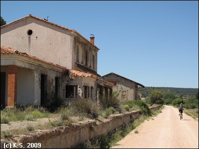 Die Ruine eines Bahnhäuschens (?). Eine breite Trasse in Richtung Villapalacios.